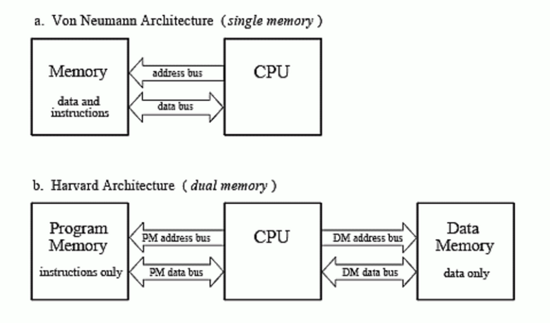當(dāng)前,雖然最近幾年有一個叫做存內(nèi)計算的架構(gòu)非?;馃?,但我們比較熟悉的處理器架構(gòu)基本都是馮諾依曼架構(gòu)(von Neumann architecture)和哈佛架構(gòu)(Harvard architecture)。其中,馮·諾依曼結(jié)構(gòu)的處理器使用同一個存儲器,經(jīng)由同一個總線傳輸;哈佛結(jié)構(gòu)是一種將程序指令存儲和數(shù)據(jù)存儲分開的存儲器結(jié)構(gòu)。