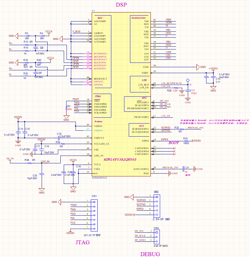 ADM16F03A2最小系統(tǒng)如下圖所示,包含JTAG接口、SPI通信接口、串口、PWM模塊、ADC模塊等。系統(tǒng)自帶的運(yùn)放PGA可以通過外圍電阻配置為差分模式用于相線電流采樣。當(dāng)需要用到SPI調(diào)試時(shí),可以通過SPI接口,借助進(jìn)芯SPI通訊調(diào)試工具進(jìn)行SPI通信調(diào)試;當(dāng)需要離線燒錄程序時(shí),通過3V3、TX、RX、GND信號(hào)測試焊盤,借助進(jìn)芯的離線燒錄工具可實(shí)現(xiàn)快速的脫機(jī)燒錄。
