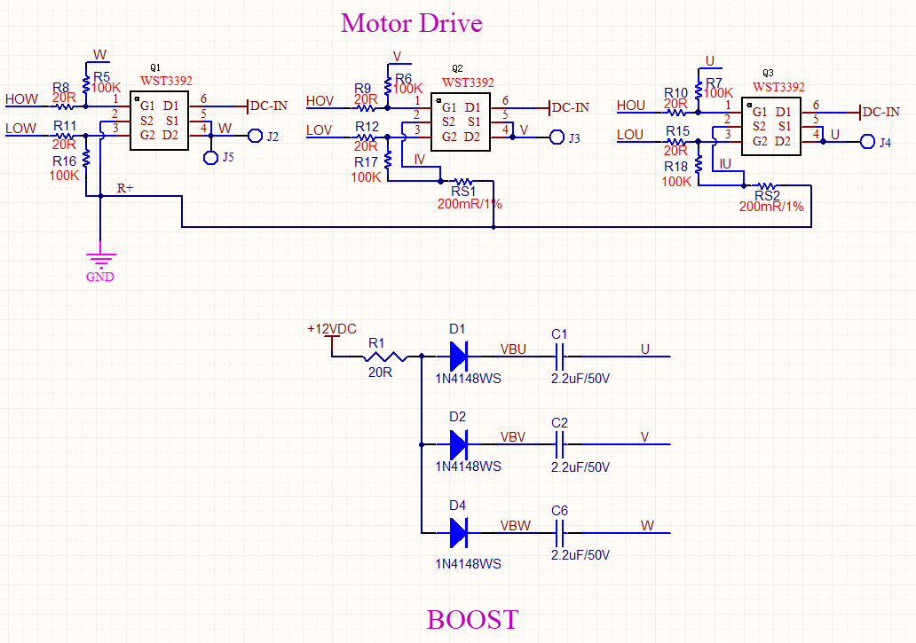 H橋電路采用上下管均為NMOS的配置,總計(jì)6個(gè)NMOS組成三相H半橋驅(qū)動(dòng)電路。